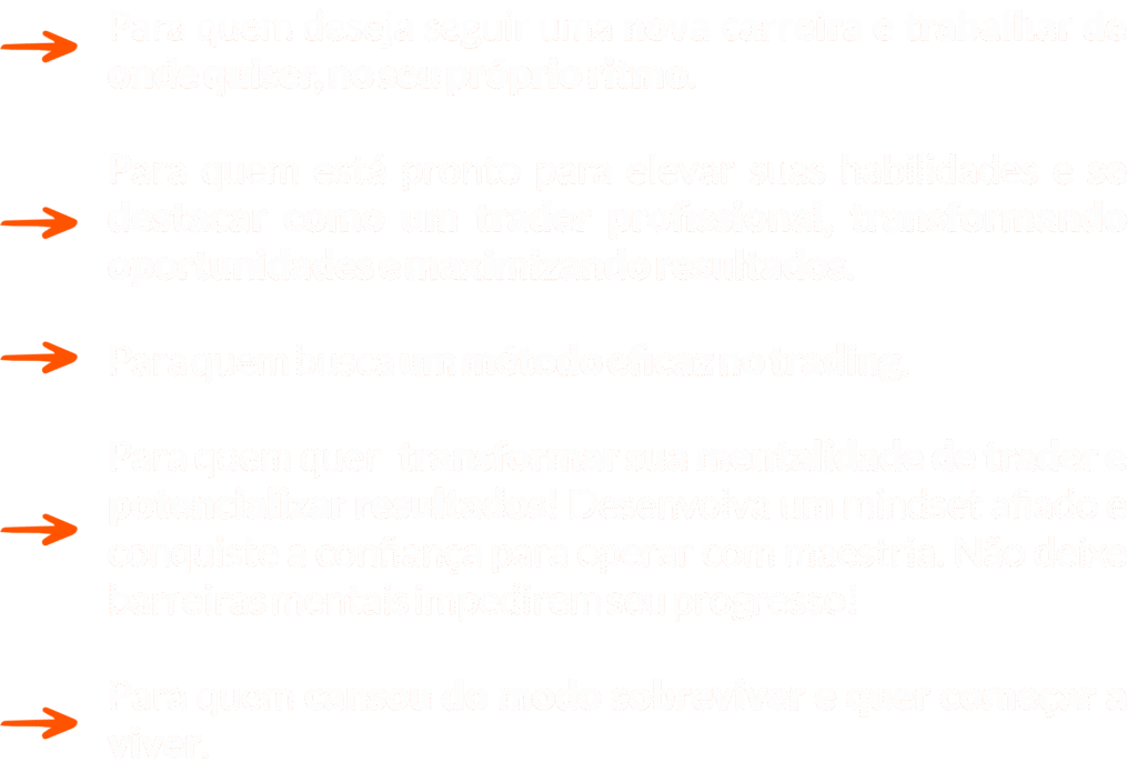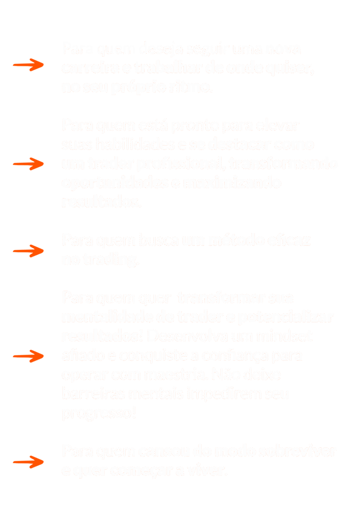 O iniciante sem experiência ou um trader em busca de consistência. Nossa formação é projetada para guiá-lo rumo à consistência através das estratégias que realmente funcionam. Esta é a oportunidade de você se profissionalizar e alcançar os melhores resultados!